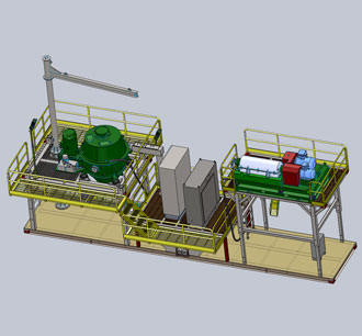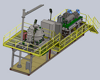 将钻屑甩干机升降支架降到最低处,离心机放于翘座的罐体上,能够满足大部分地区内陆运输的要求, 无须拆卸甩干机和离心机。