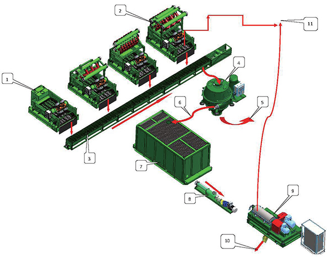 钻井泥浆不落地处理工作流程说明如下:钻机过来的泥浆通过高架管汇进入振动筛(1)、清洁器(2),经过(1)、(2) 处理排放的钻屑通过螺旋输送器(3)输送至立式甩干机处理(4)。立式甩干机处理完的固体通过废渣(5) 排除,回收到的钻井泥浆(6)进入钻井液泥浆罐体(7),离心机供液泵或螺杆泵(8)抽取含有细固 颗粒的回收泥浆,供给离心机(9 )处理,固体部分通过固体排渣口(10)排除,处理完成的钻井液通 过干净泥浆回归泥浆系统(11)。