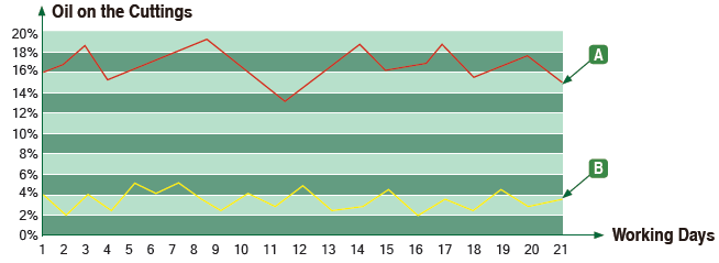 B: 冠能钻屑甩干机处理后的钻屑含油量。
