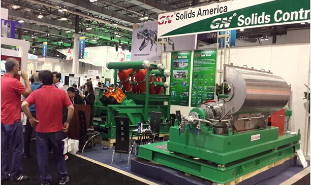 本次我公司参展的是一台处理量达240立方米/小时(1056GPM )的泥浆清洁器和一台GNLW553 - VFD是钻井液离心机。GNLW553 – VFD离心机是一台大体积大处理量的离心机,具有专门的变频器和PLC控制系统进行快速处理操作。