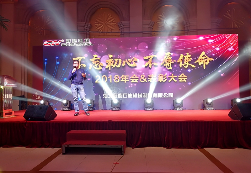 我们总经理,周鹏先先生在年会致辞中说:“我们创立冠能固控的初心就是创造一个世界较好的品牌。经过10年的发展,我们的品质和品牌知名度已经逐步获得广大客户的认可。在国内市场,我们已经与国内三桶油有了深入合作,也是国内各大钻机厂优选配套供应商。在国际市场,我们已经远销世界多个国家和地区,获得了包括贝克休斯,埃及国家泥服,俄石油,美国客户等的高度认可。在过去的2017年,宏观市场并不好的情况下,冠能公司业绩获得了20%的增长。回 初心,我们不辱使命。当然,我们既要为自己取得的成绩自豪,更要面向未来。为适应未来的发展需要,公司已经在唐山玉田新购买120亩土地,用于新工厂的建设。在新工厂,我们要打造智能化制造工厂,包括引进机器人,工业物联网技术,MES现场生产管理系统。通过先进的制造技术,去确保产品品质,提高生产效率。为创建名族品牌贡献一份力量。”