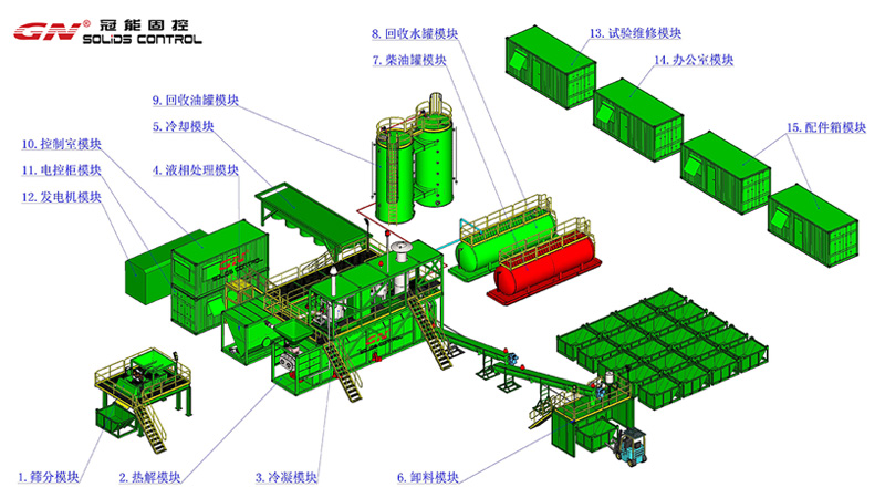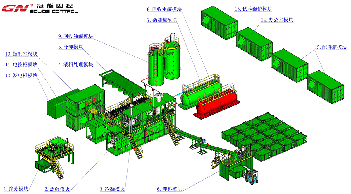 主要模块单元 筛分模块、热解模块、冷凝模块、液相处理模块、冷却塔模块、卸料模块、柴油罐模块、
